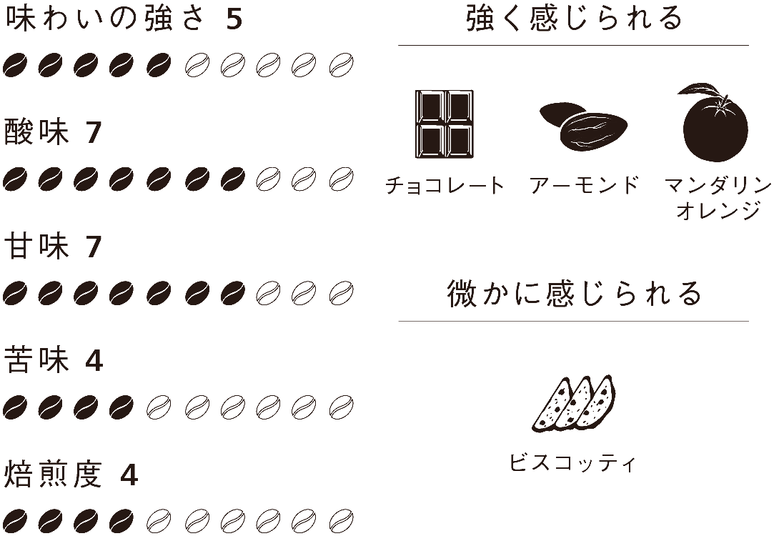 【風味の傾向】清涼感と果実味溢れる柑橘の印象とほろ苦いチョコ レートのフレーバー。 芳ばしさとほどける飲み口がなんとも心地よい。